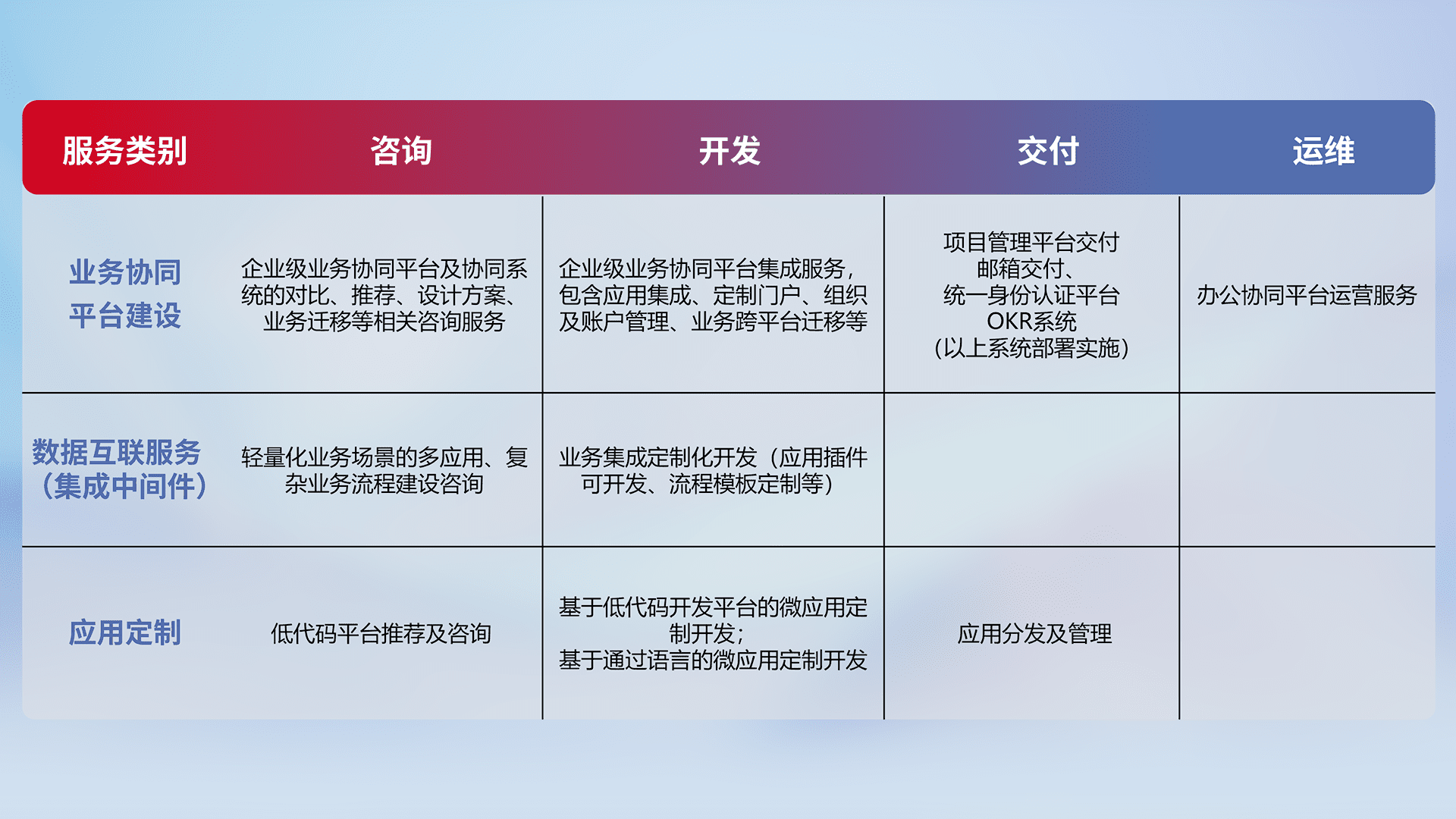 针对钉钉、、、、企微、、、IDaas等平台级产品提供产品的规划、、方案、、交付、、、、定制化开发等服务,,,实现如统一协同办公、、、智能客户服务、、混合会议管理、、、智能数据查询、、、、等业务场景,,实现数字化转型。。。。